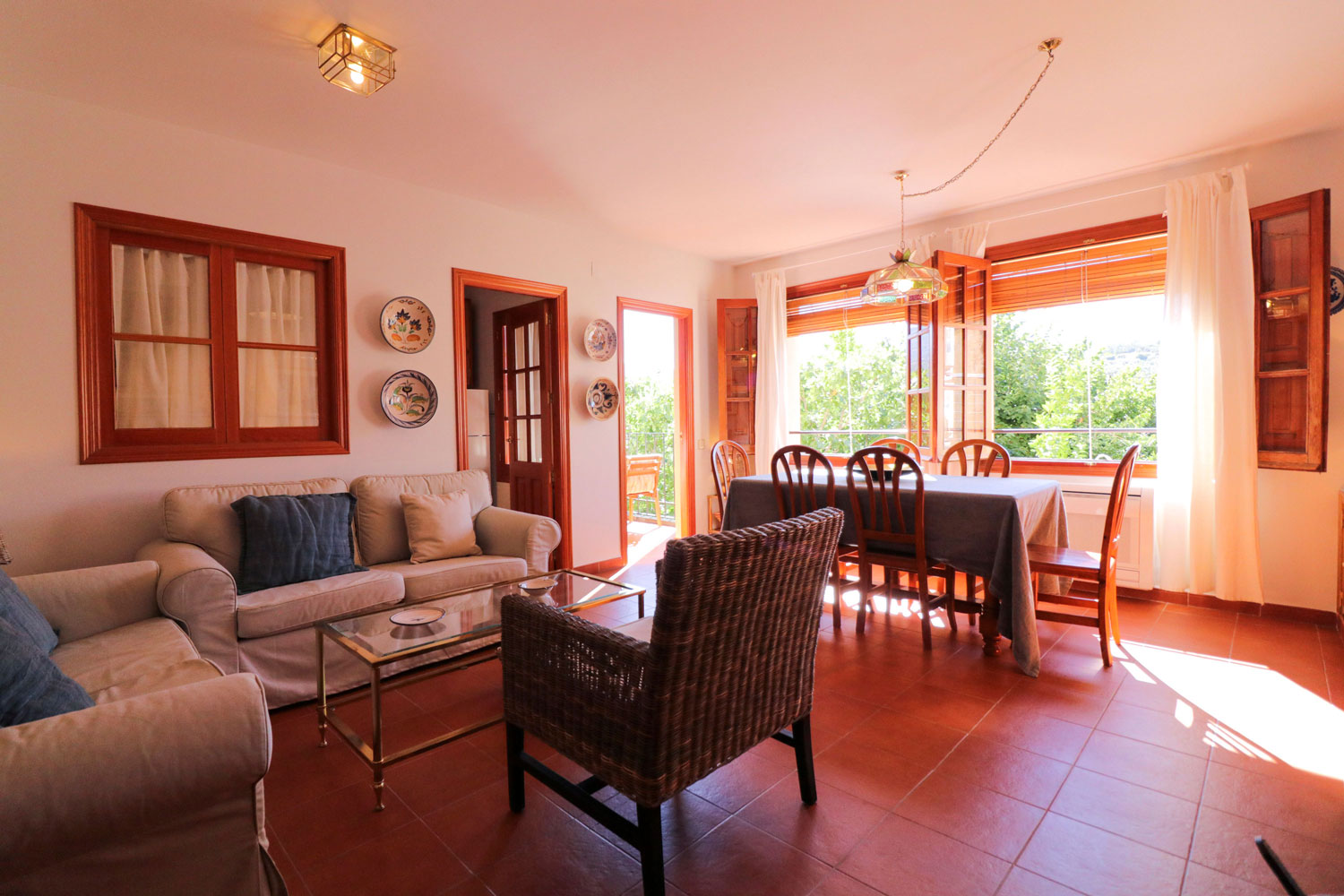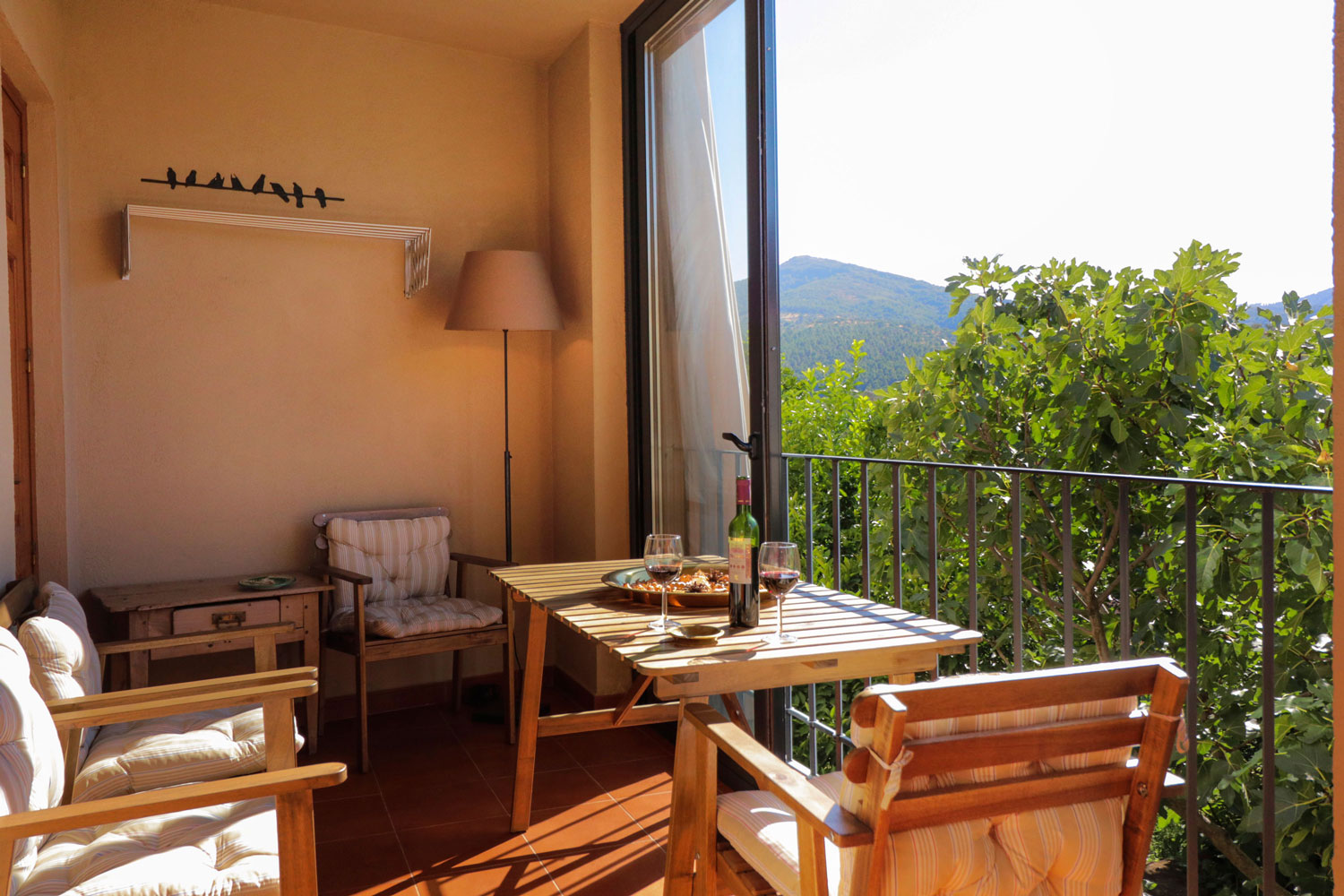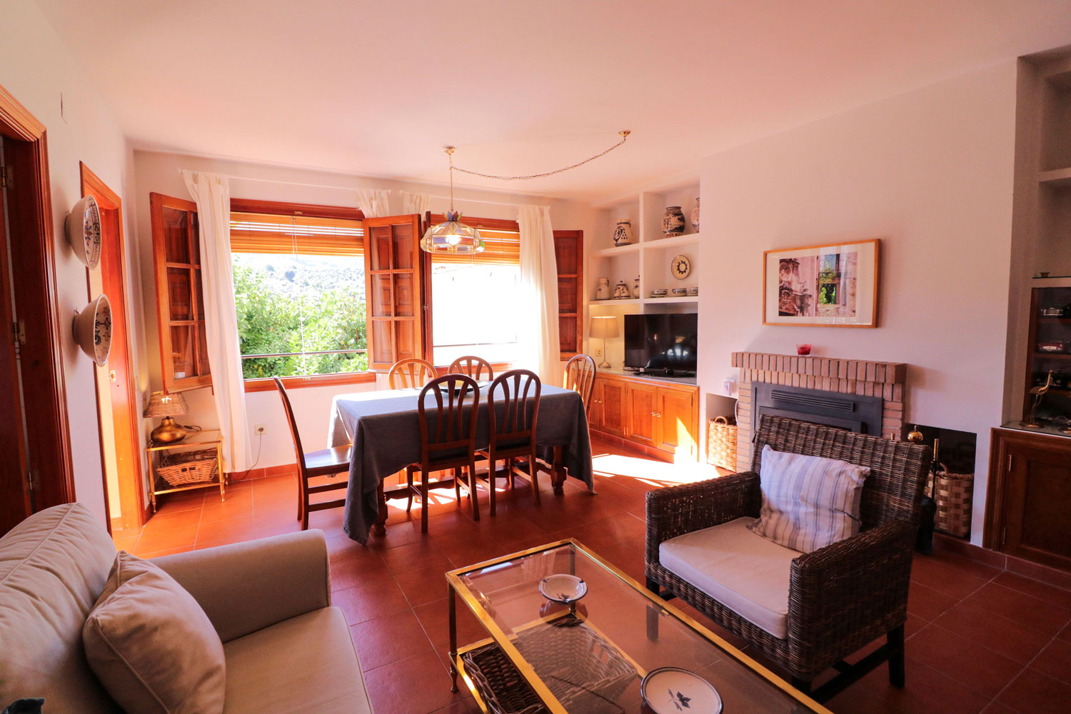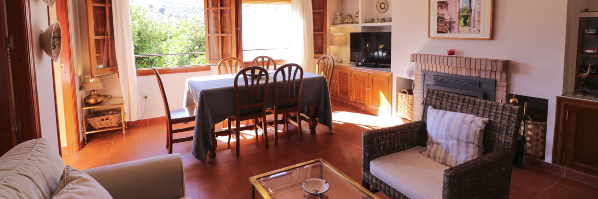 En el primer piso de la casa, se encuentra este apartamento completo, totalmente equipado con cocina, salón con televisión y chimenea, terraza privada con vistas a la sierra, baño completo y dos habitaciones.